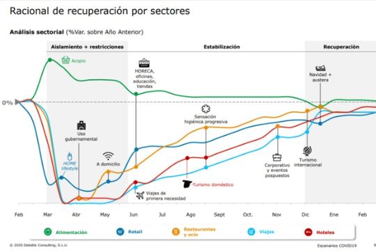 En esta ocasión voy a citar un recursos de análisis de la empresa Deloitte Consulting, RACIONAL DE RECUPERACIÓN POR SECTORES, se consideran los siguientes mercados: